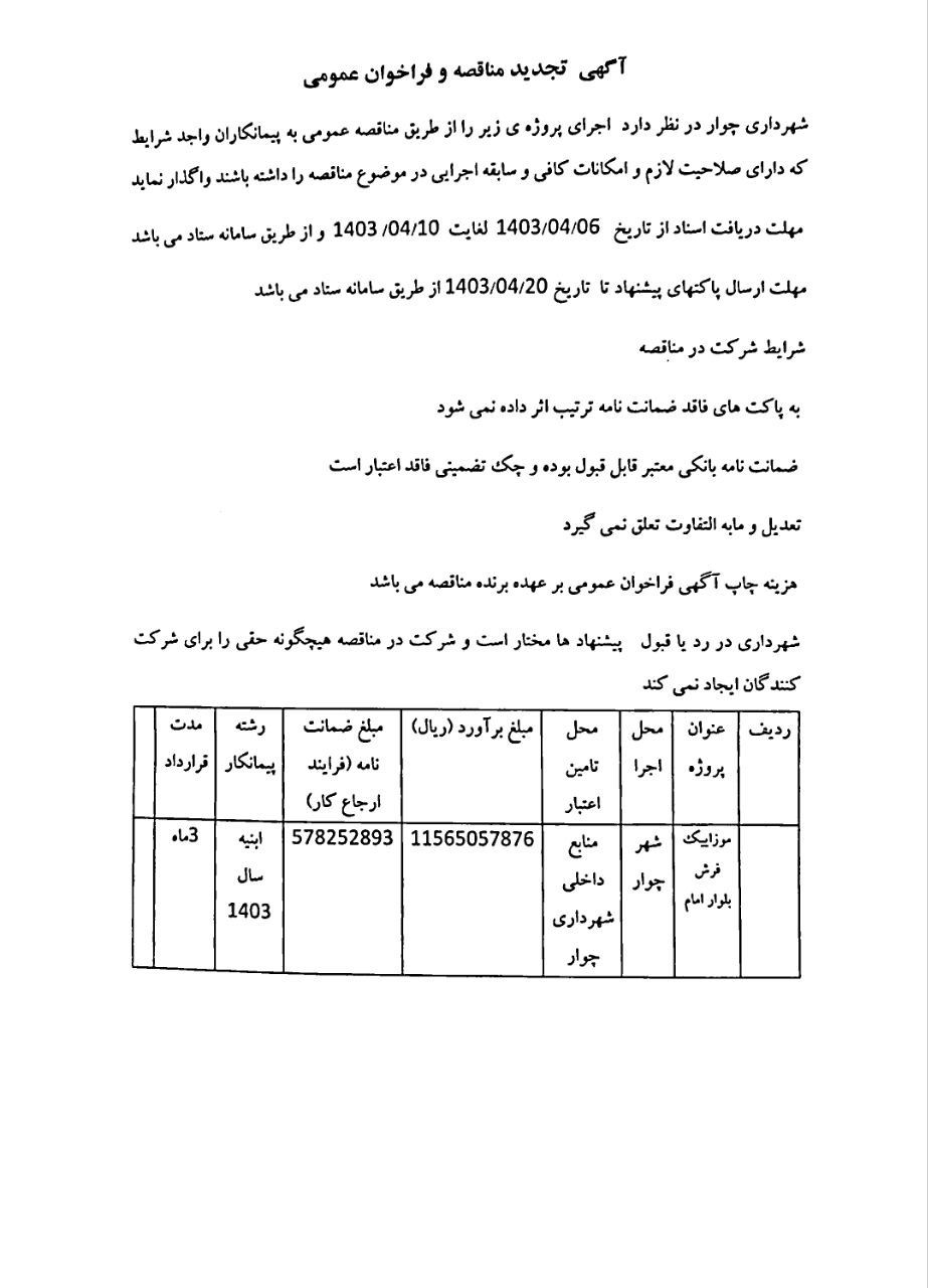 آگهی تجدیدمناقصه و فراخوان عمومی پروژه موزاییک فرش بلوار امام(ره)