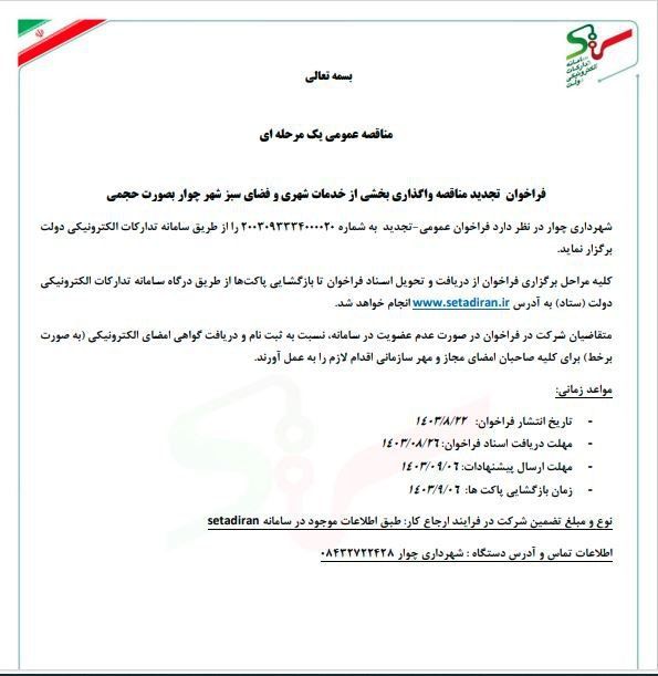 فراخوان تجدید مناقصه واگذاری بخشی از خدمات شهری و فضای سبز شهر چوار بصورت حجمی